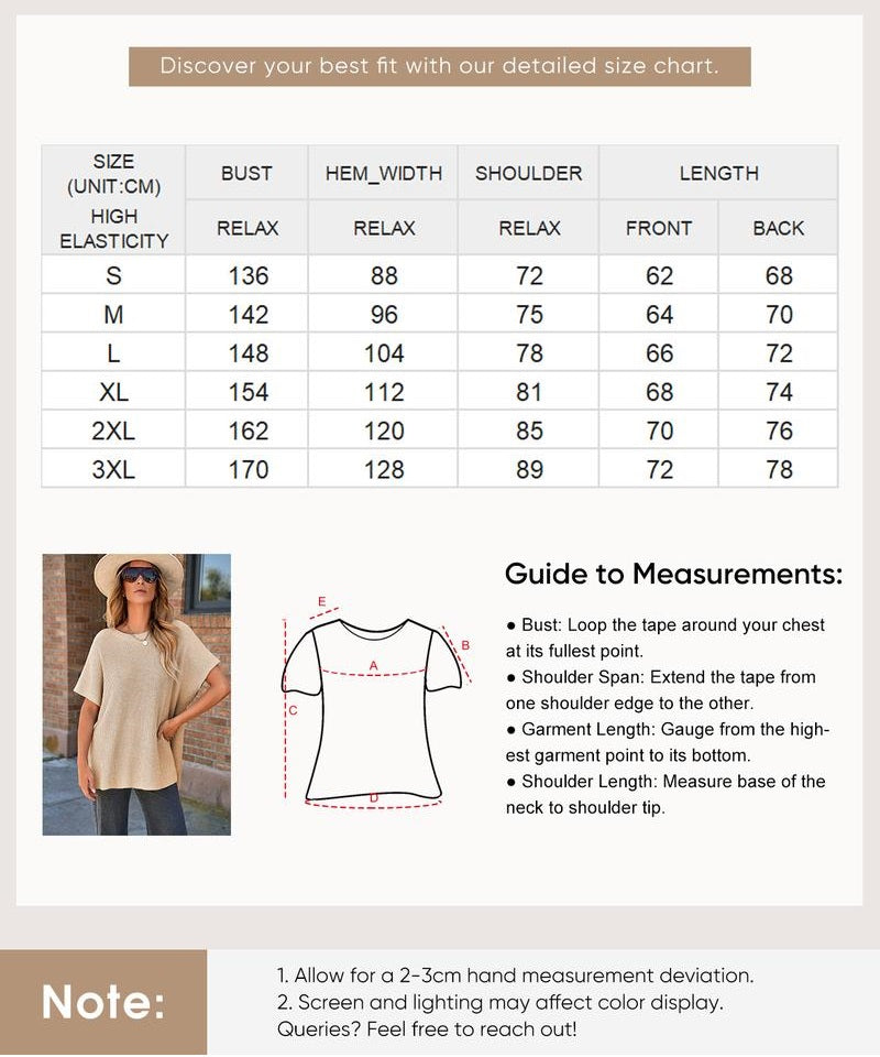 This oversized short sleeve sweater is designed with a loose yet stylish silhouette, making it comfortable and chic across all body types. Available in a full range of sizes to suit your perfect fit.